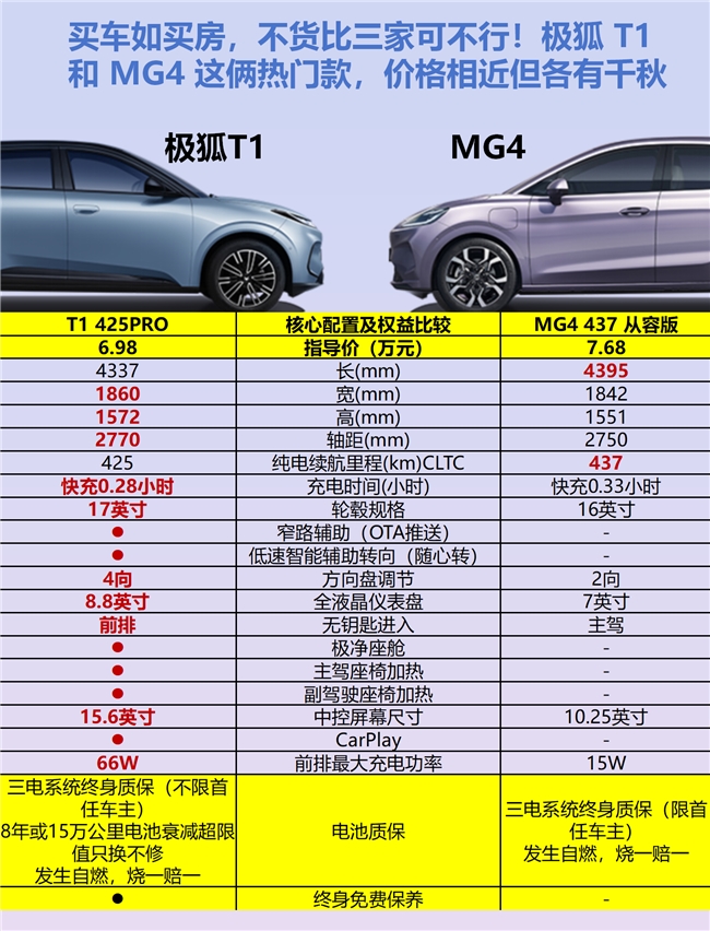 最后聊价格。MG4入门版6.88万,配16寸钢圈、织物座椅;想要天幕、皮座、大屏,得冲到9万多的顶配。T1 6.28万起,上面说的配置全齐,还附送3.3kW外放电,周末露营电火锅、投影仪一起上,MG4全系没有放电功能。